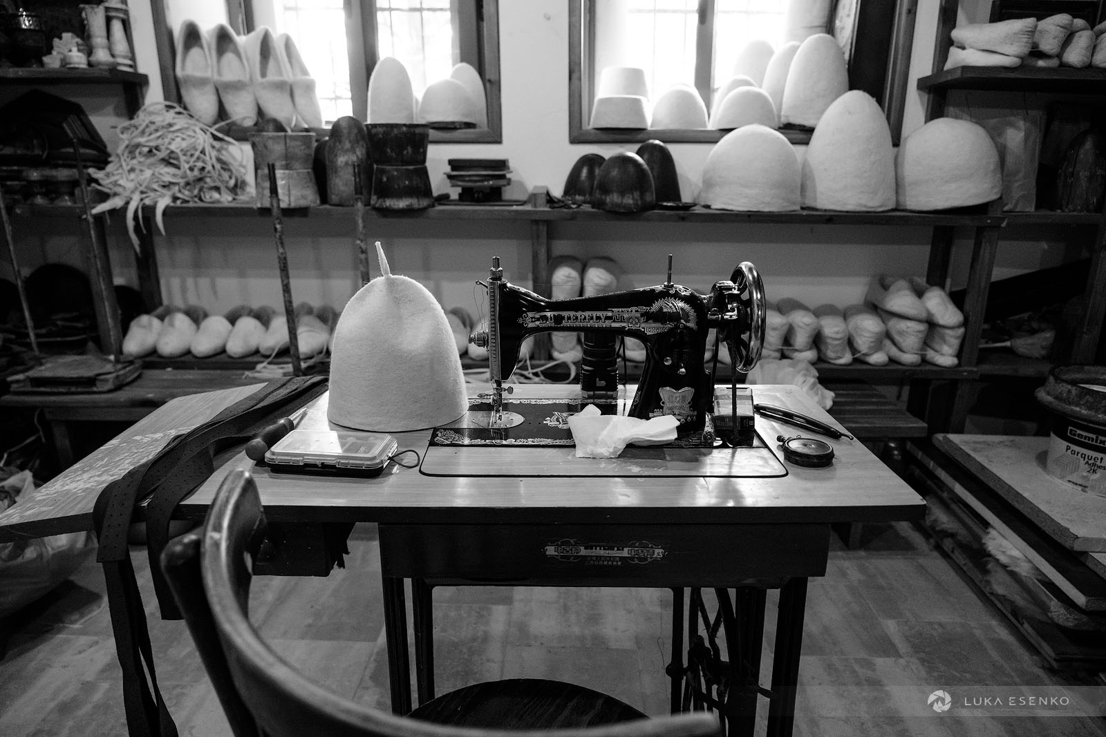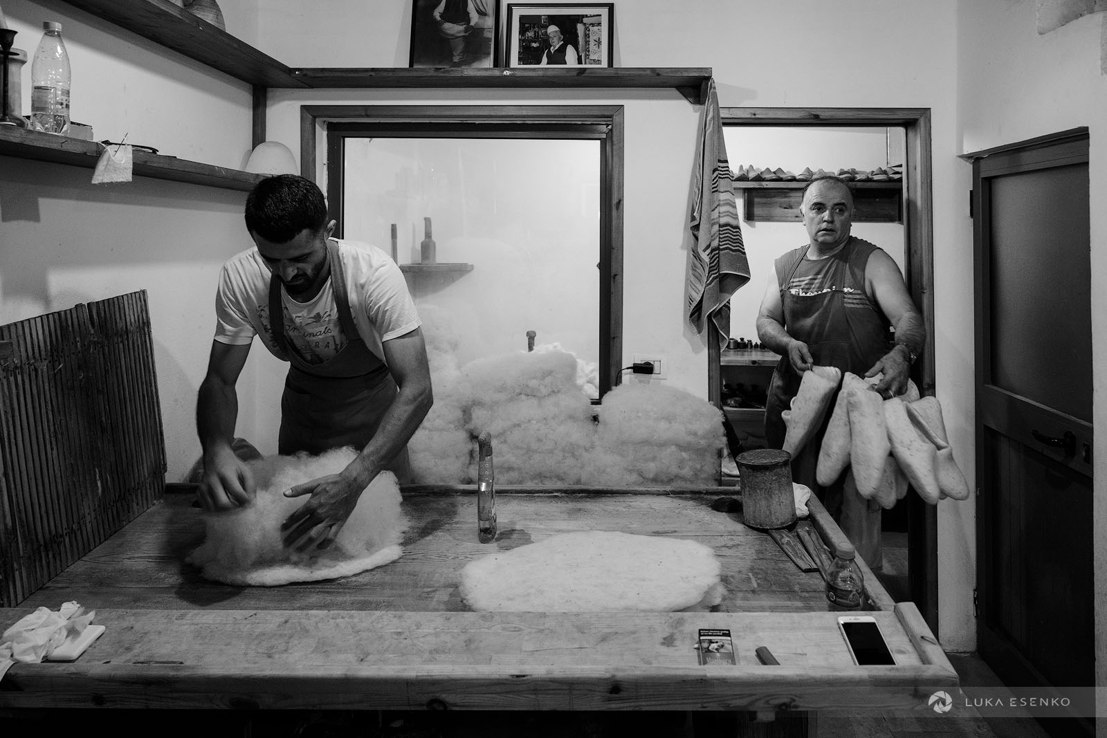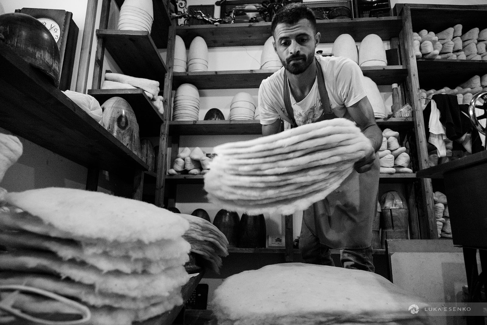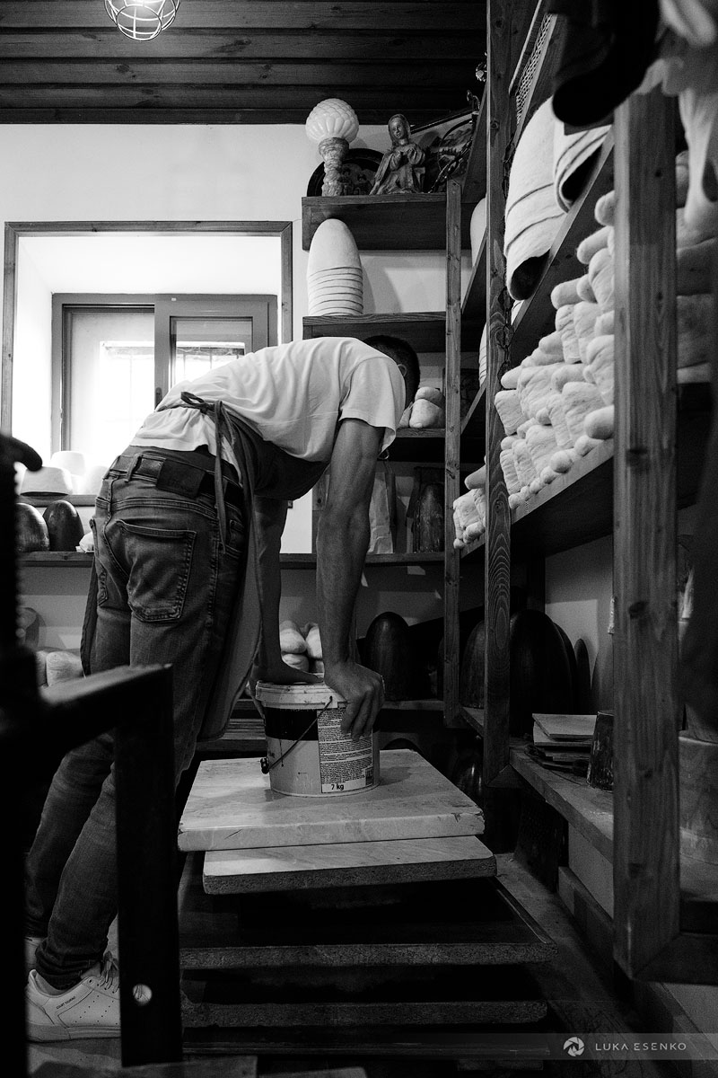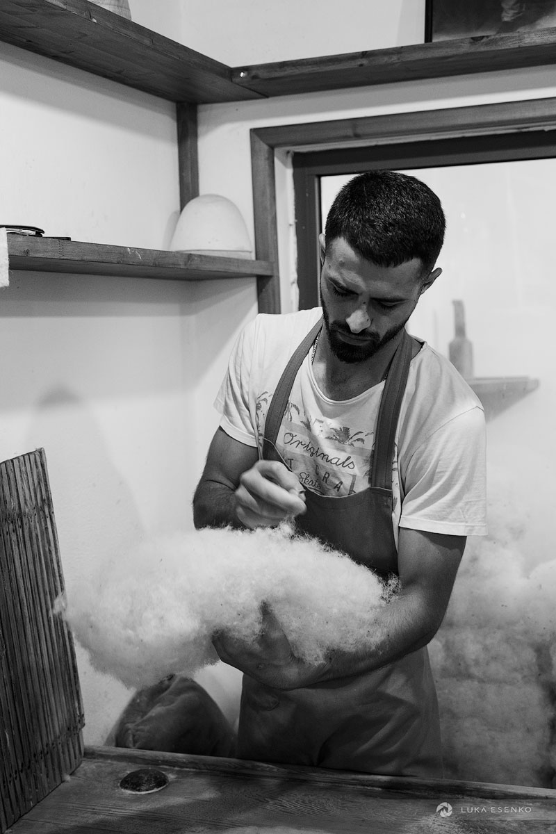 Downstairs, Ndriçim was skillfully processing wool with his specialty bow and wooden hammer. I quietly observed him for a while before he paused and asked where I was from. “Slovenia,” I replied, adding, “Amazing workshop! This seems like hard work.” He nodded in agreement, then glanced at my camera. “Have you seen the signs above?” he asked. “Yes, I did,” I answered. “You can take photos,” he said with a smile. “The signs are for the tourists who don’t respect my craft.” “Faleminderit,” I responded, and began taking photos as he resumed his work. Below is a series of photos that capture the traditional process of making felt hats and slippers. I took these photos over the course of two days to capture the entire process of making the Albanian hat.