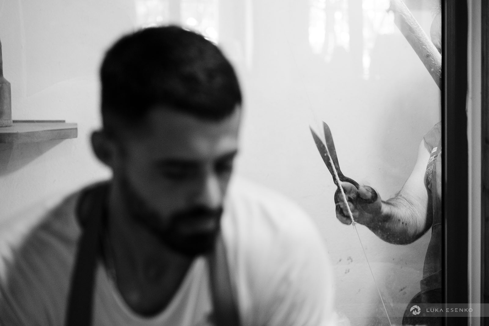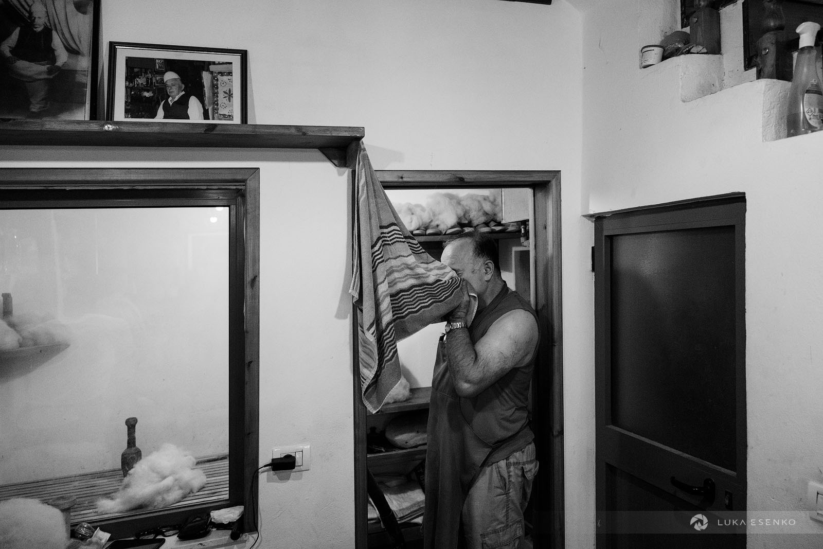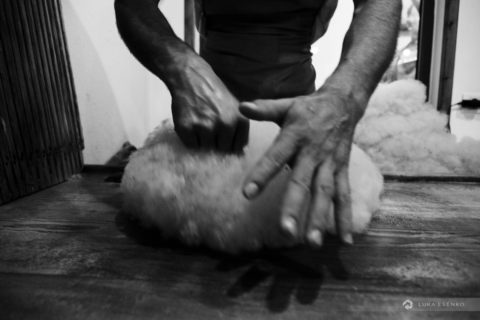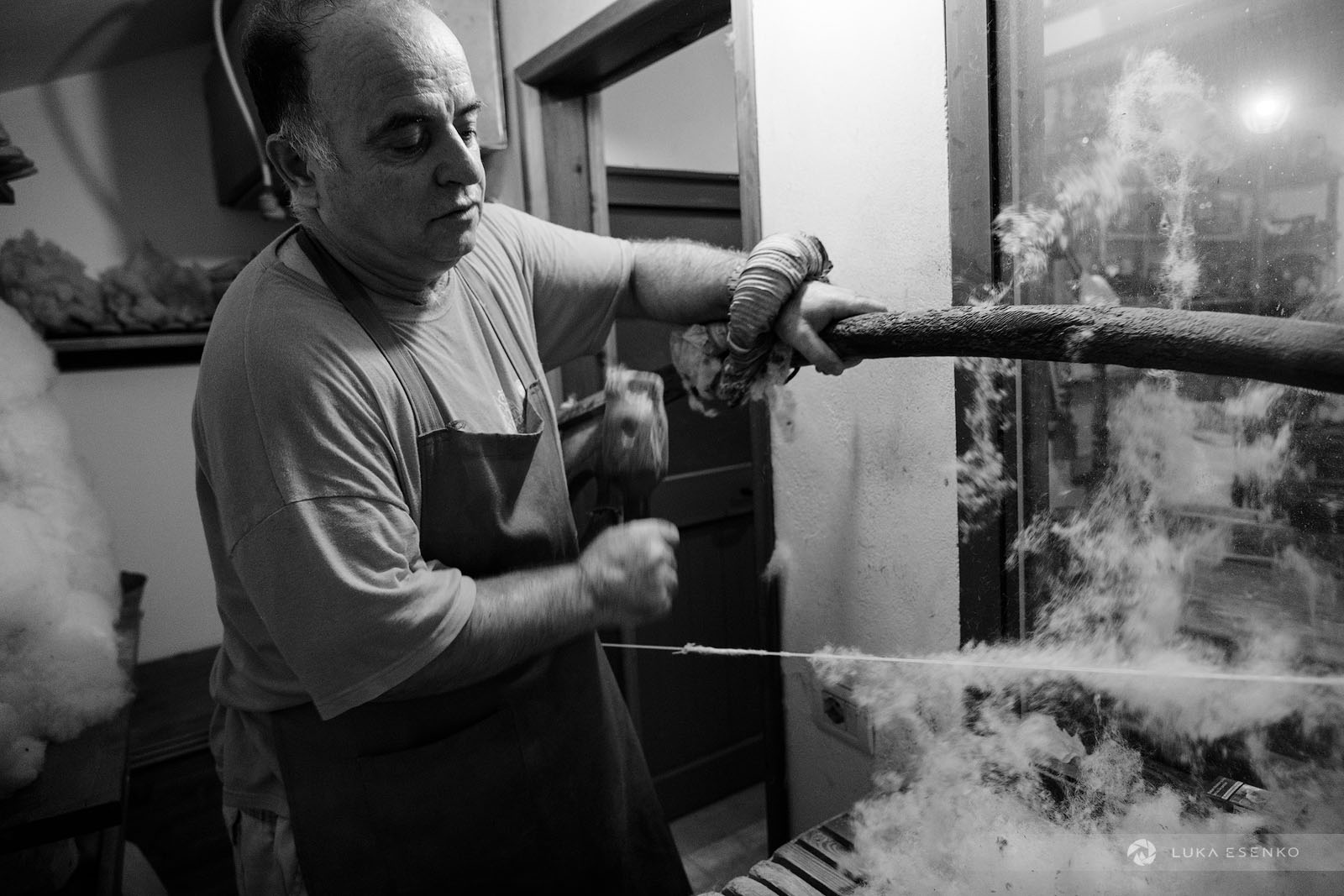 Downstairs, Ndriçim was skillfully processing wool with his specialty bow and wooden hammer. I quietly observed him for a while before he paused and asked where I was from. “Slovenia,” I replied, adding, “Amazing workshop! This seems like hard work.” He nodded in agreement, then glanced at my camera. “Have you seen the signs above?” he asked. “Yes, I did,” I answered. “You can take photos,” he said with a smile. “The signs are for the tourists who don’t respect my craft.” “Faleminderit,” I responded, and began taking photos as he resumed his work. Below is a series of photos that capture the traditional process of making felt hats and slippers. I took these photos over the course of two days to capture the entire process of making the Albanian hat.