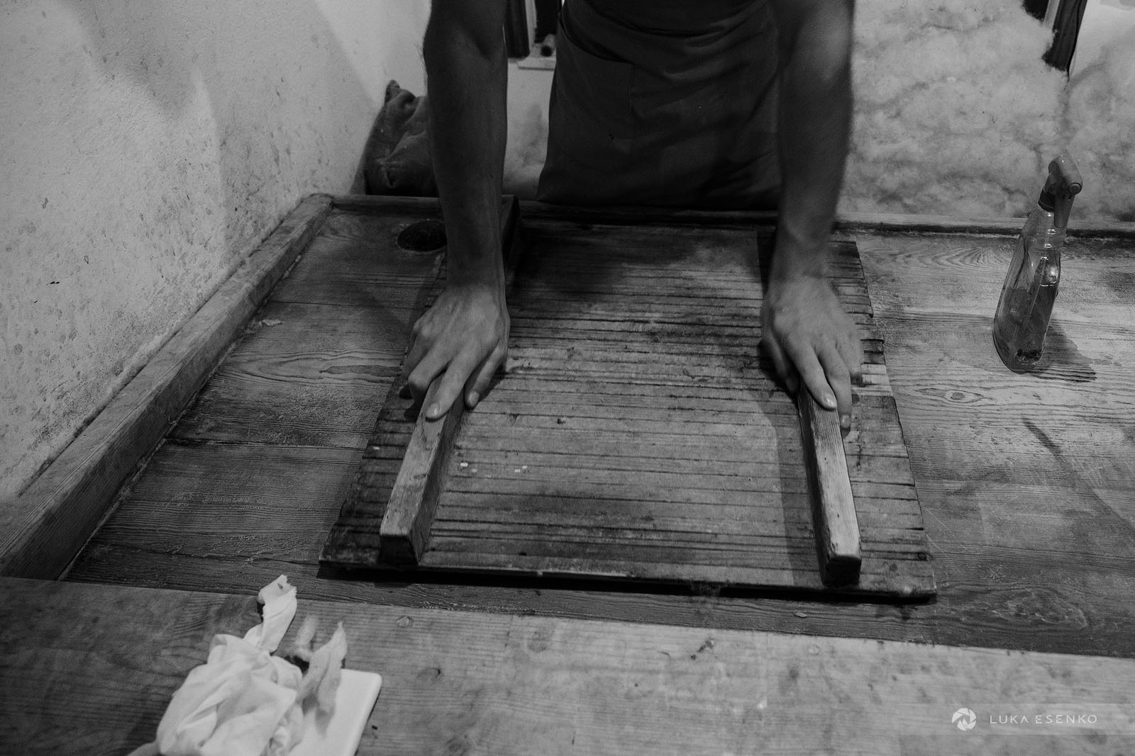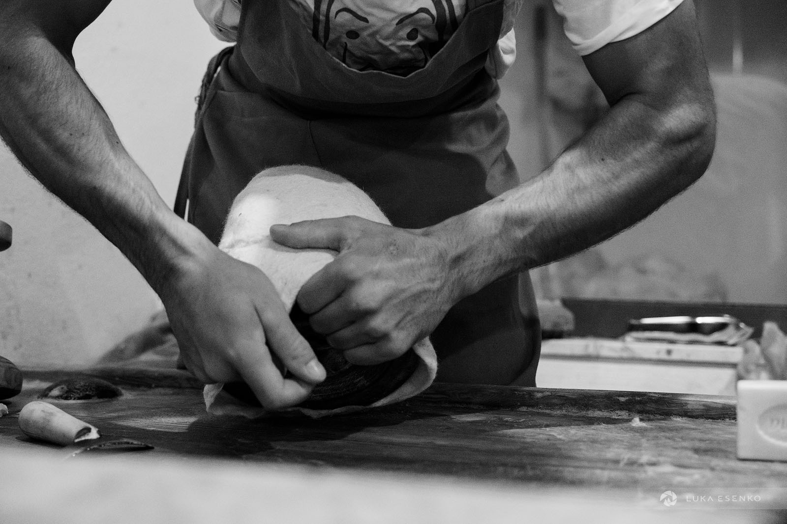 Ndriçim uses his bow and a wooden hammer to separate and loosen the wool fibers. He then forms loose balls of wool, each sized to fit a single hat or slipper. Ardian takes these balls and transfers them to his work table, where he compresses them into thin, pizza-shaped sheets. These are then pressed under weights overnight to make them even thinner.