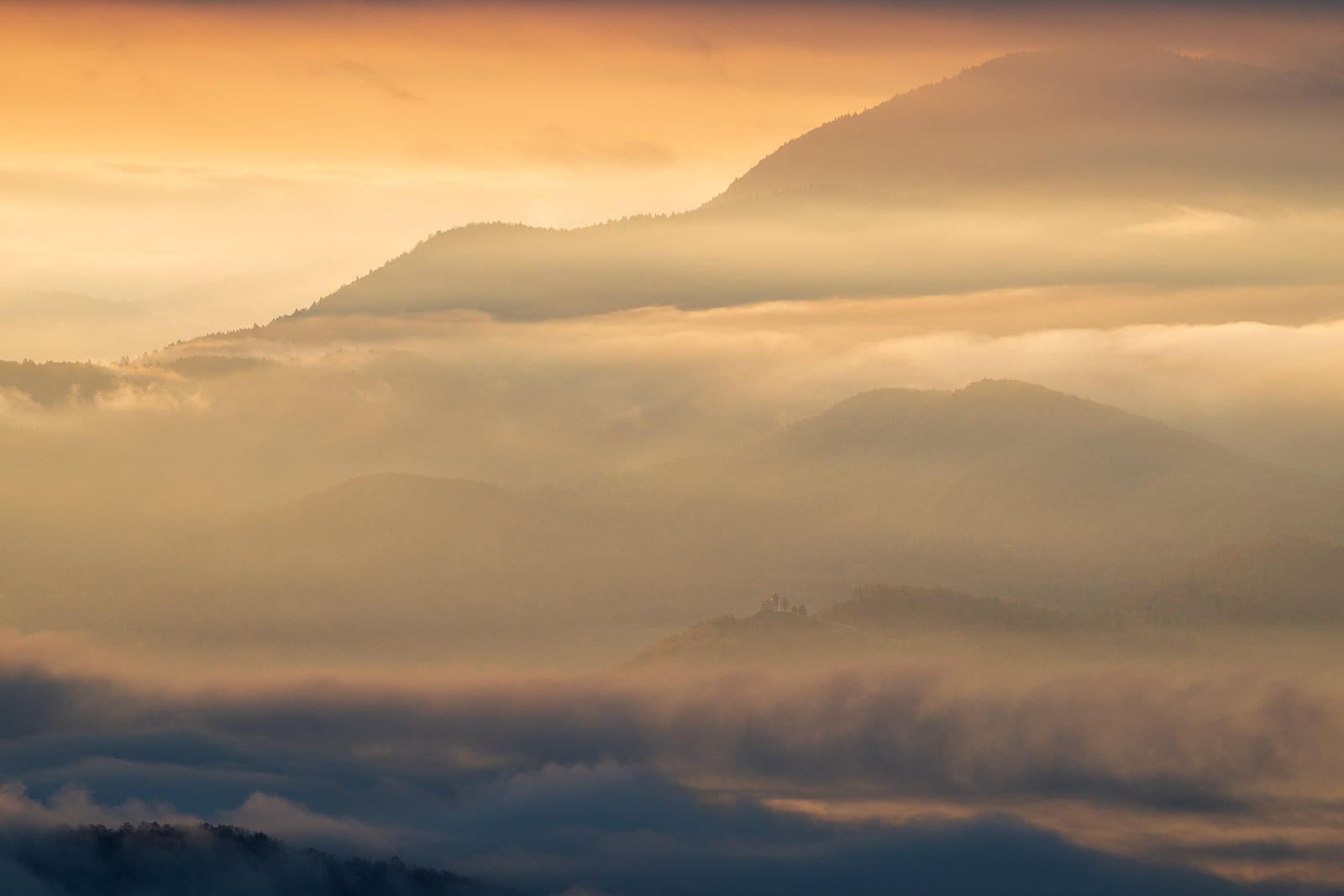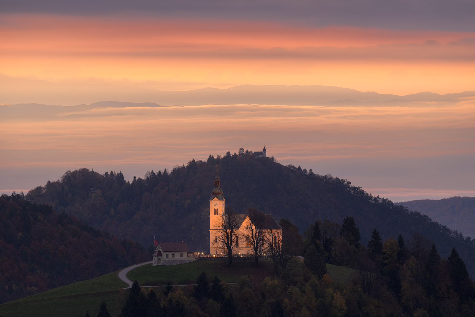 Still buzzing from the previous evening, I headed out early the next morning. My plan was to photograph around Škofja Loka, but the fog was far too thick, so I changed course and drove toward Polhov Gradec instead. On the way, a completely new view stopped me in my tracks: the church of Sveti Lenart (St Leonard) at Črni Vrh, glowing like a beacon against the dark, rolling hills.