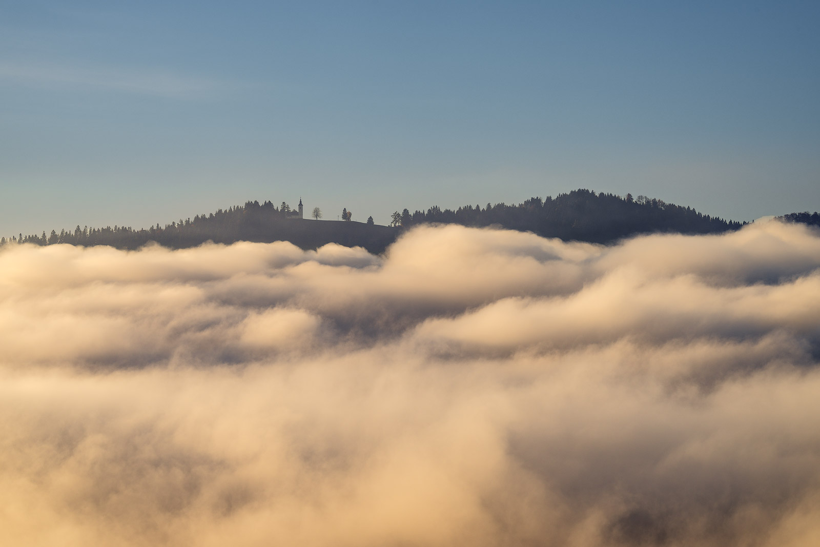 My last outing was another sunrise mission. I headed back toward Škofja Loka, hoping the fog would finally play along. I didn’t end up anywhere I had planned — instead, I found myself in a completely different spot, perched just above the fog line with the landscape drifting in and out of a soft, glowing sea of mist.