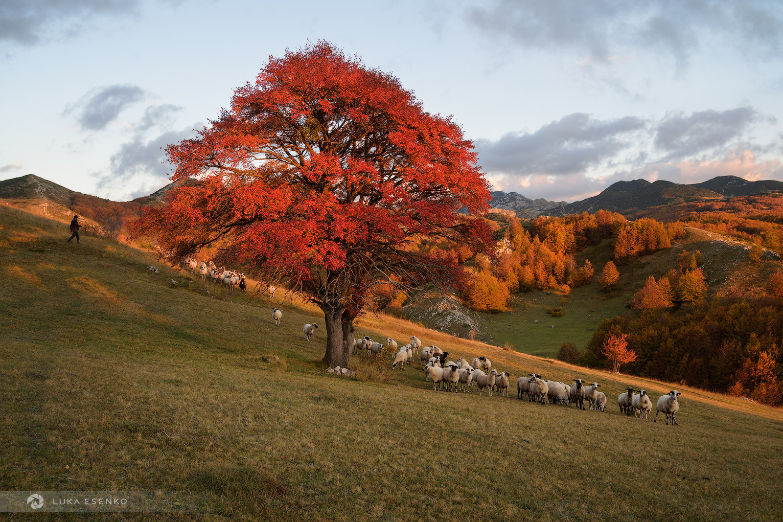 The light kept getting nicer, and just as I was looking for the perfect angle, I heard sheep in the distance. A whole herd was running towards me and the tree. As they arrived, they suddenly noticed me — all stopped and looked at me at once. At that exact moment, the shepherd walked into the frame. Click!