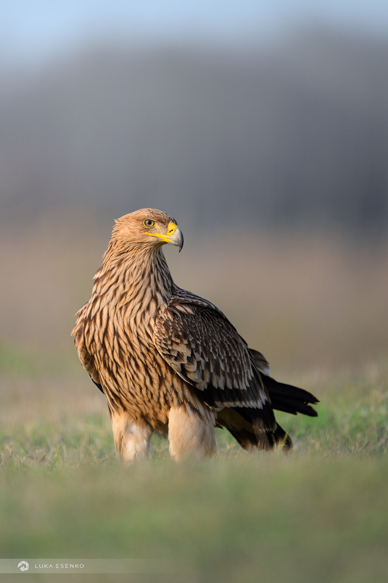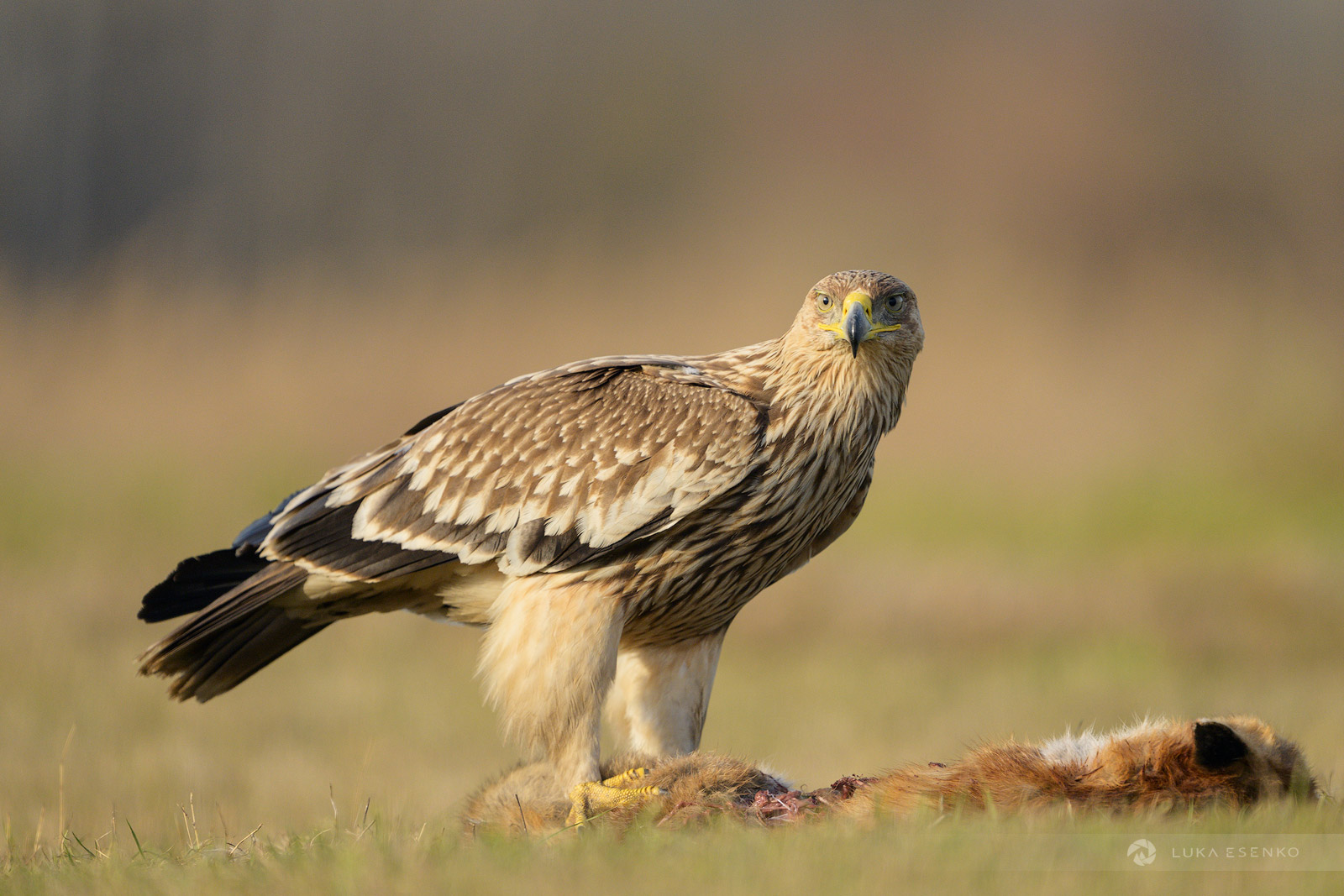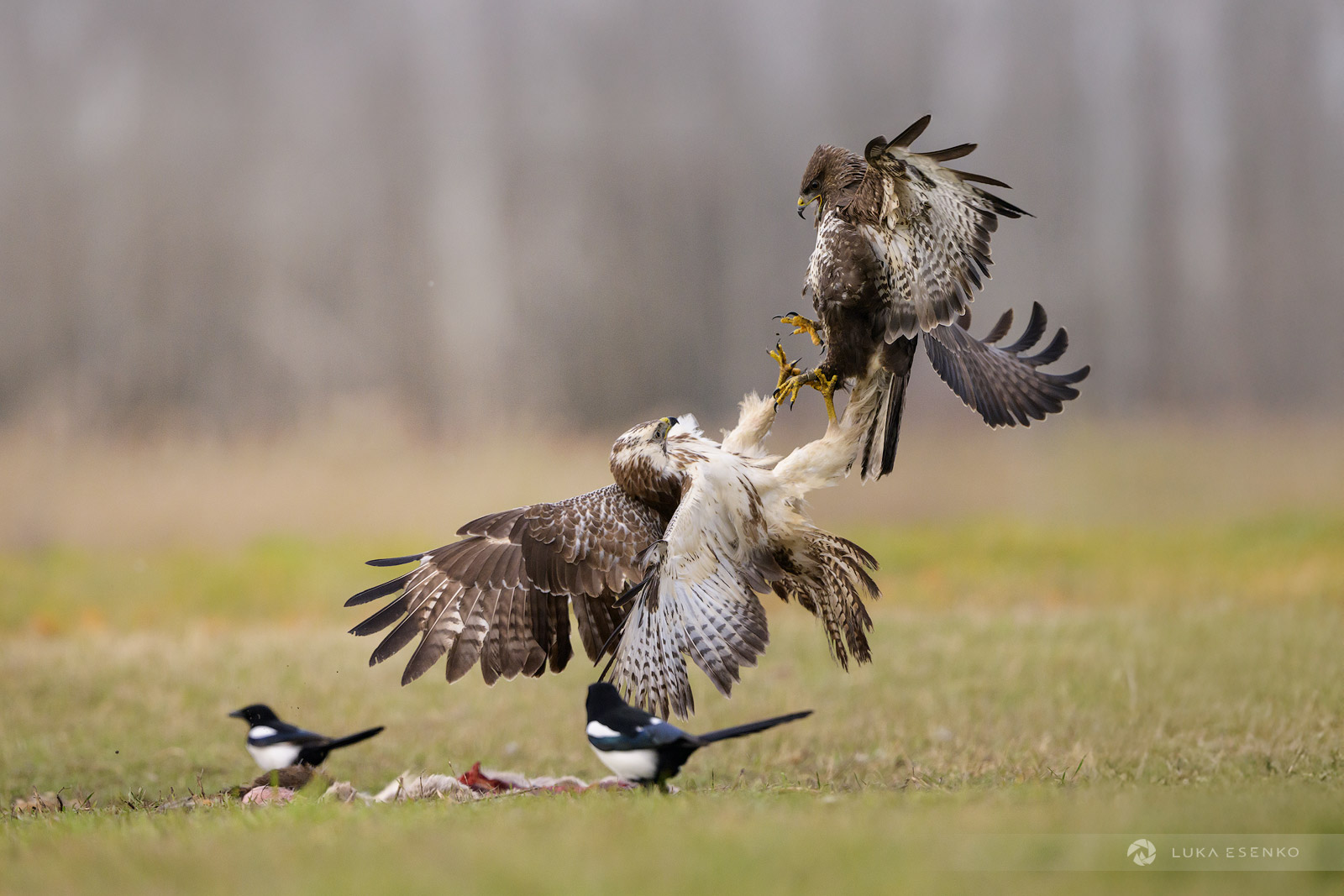 As daylight broke, the first birds appeared—magpies and crows. Shortly after, common buzzards began arriving. We watched in awe as they fed and squabbled, perching on the ground and nearby trees. The first eagle of the day, an Eastern imperial eagle, made a cautious approach. It took several attempts before it finally gathered the courage to feed.