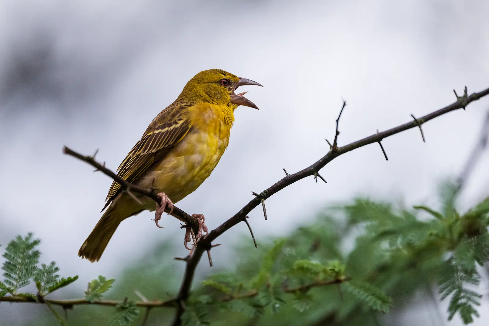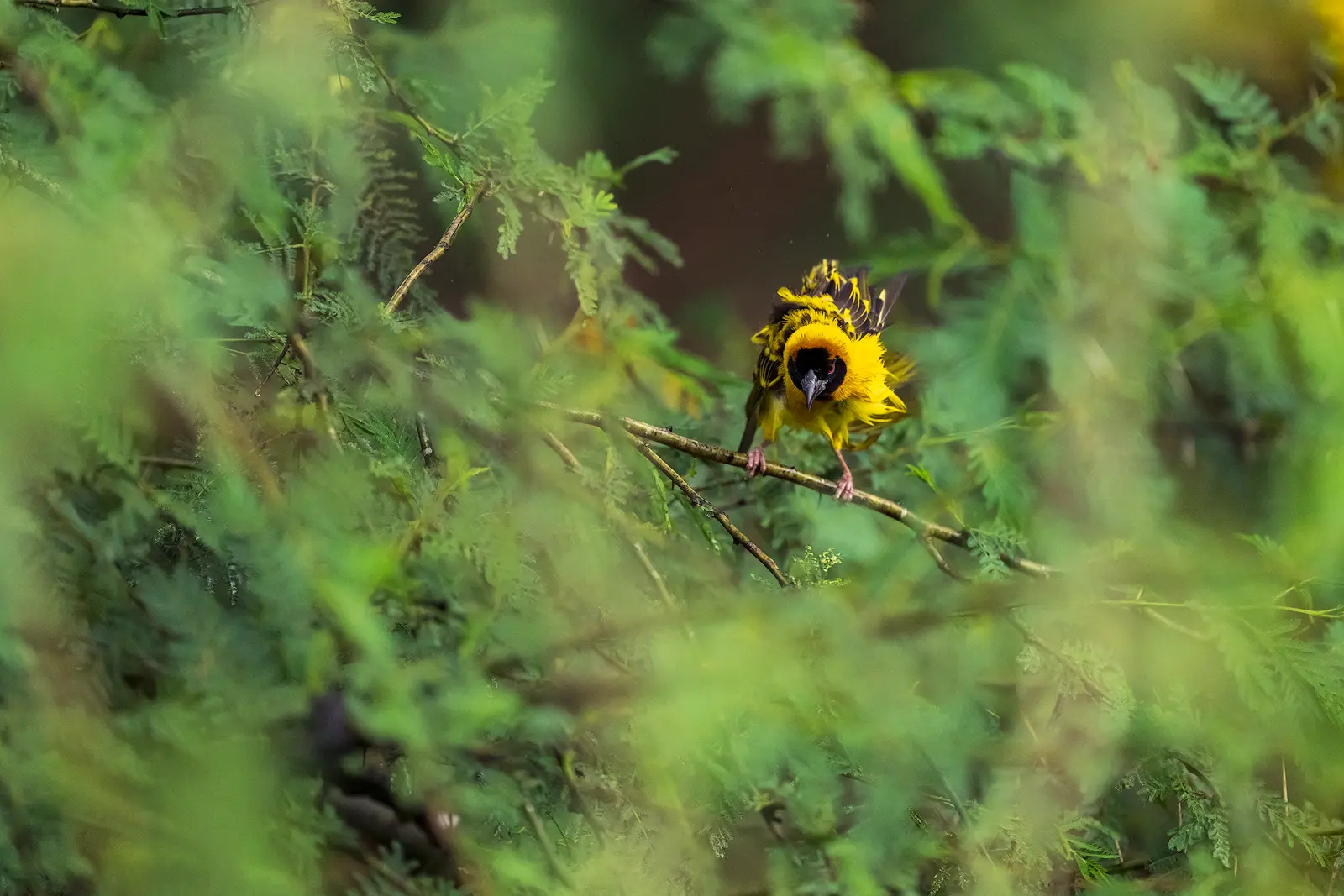 The black-headed weaver (Ploceus cucullatus) — in Slovene črnoglavi tkalec — is one of the most widespread and adaptable weaver species in sub-Saharan Africa. In Uganda, people simply refer to them as weavers, and in many local communities, they’re known for their noisy colonies rather than for a specific name. Males in breeding plumage are unmistakable: bright yellow body, deep black head and throat, and sharp, restless movements. Outside breeding season, the colours are softer, but their behaviour remains just as energetic. They are colonial nesters, building dozens — sometimes hundreds — of intricately woven hanging nests in a single tree. The males construct the nests entirely from fresh grass strips, weaving them with remarkable precision to attract females, who inspect the structure carefully before accepting it. Constant chatter, wing flicking, chasing and territorial disputes are all part of daily life in a colony.