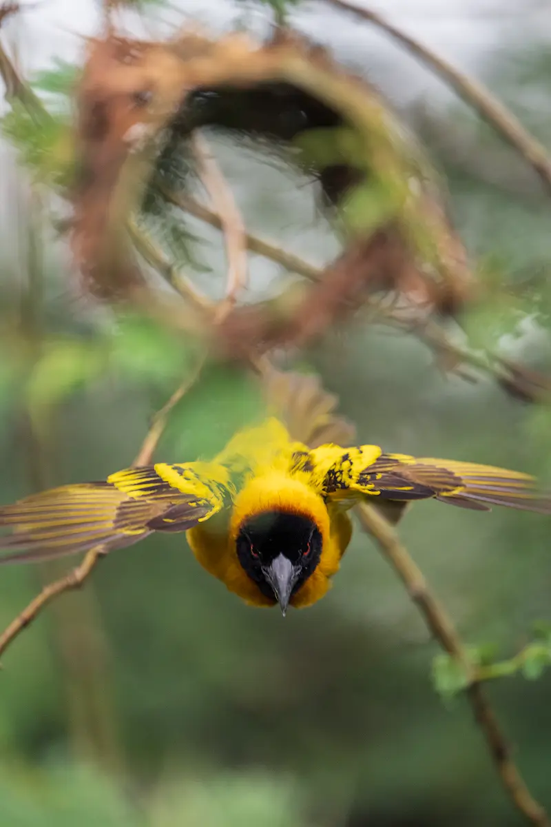 I was leading a photography tour to Uganda, and we were staying at Embogo Lodge, in the Ishasha sector of Queen Elizabeth National Park. When we arrived, there was a tree full of empty black-headed weaver nests. Dozens of them hang from the branches. They were beautifully woven, perfectly shaped — and completely empty.