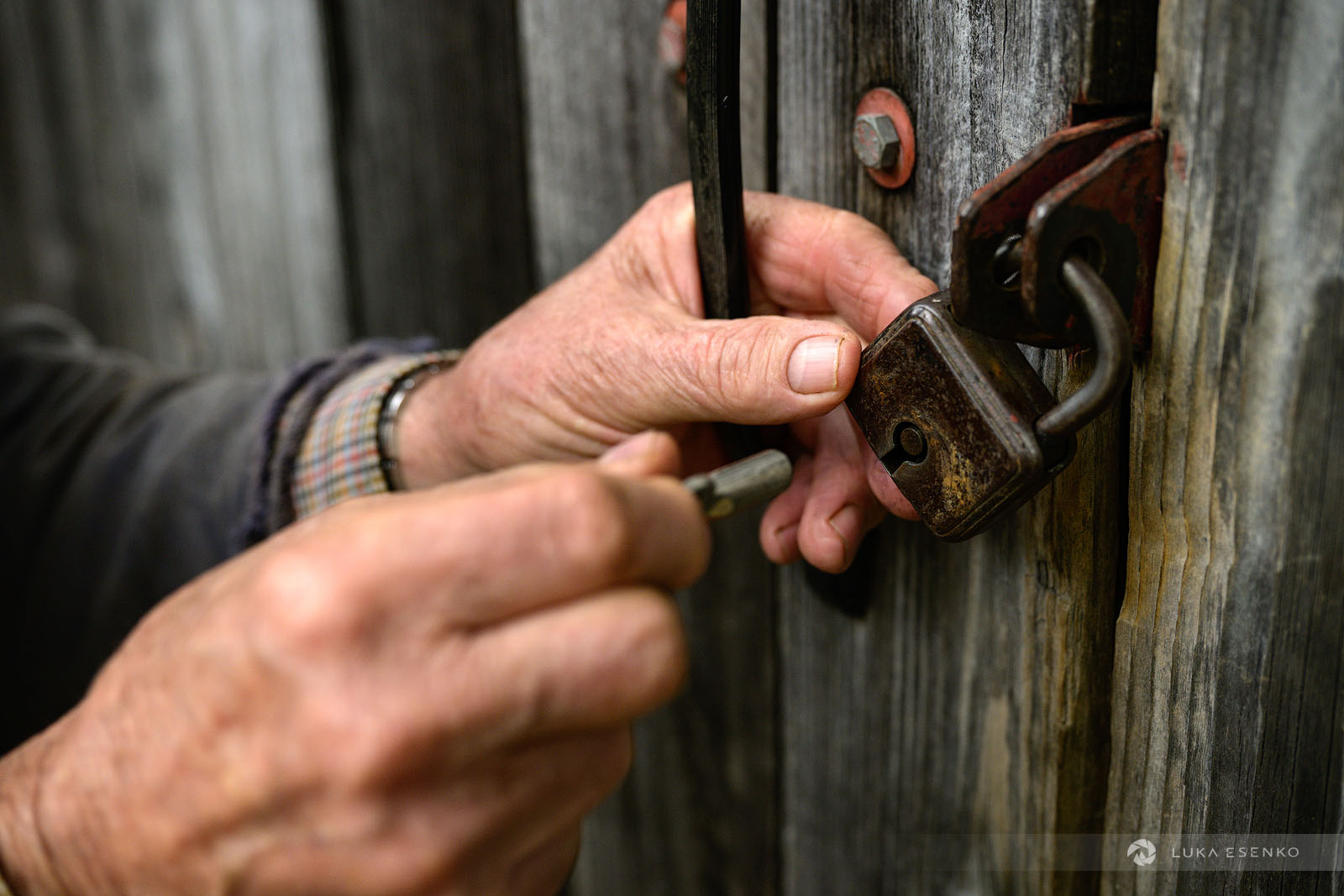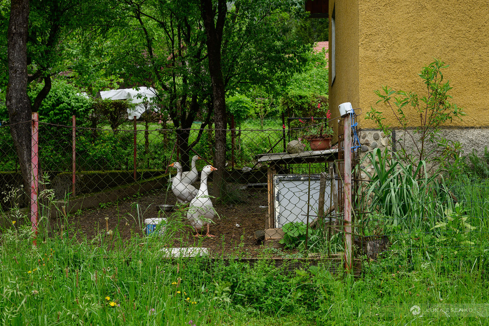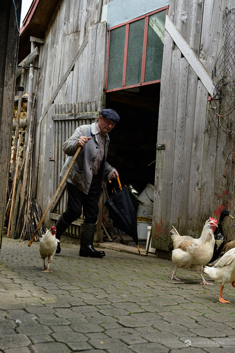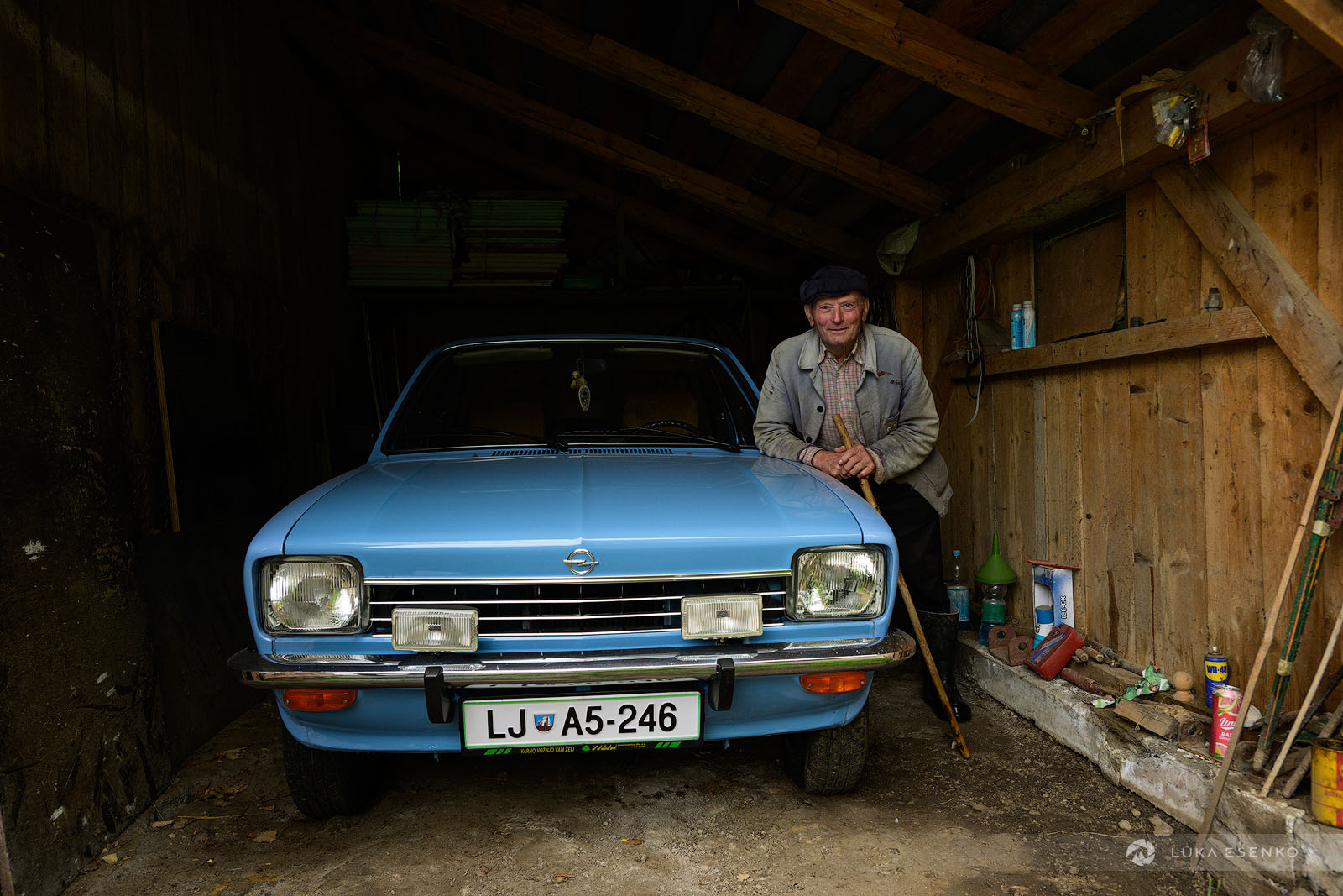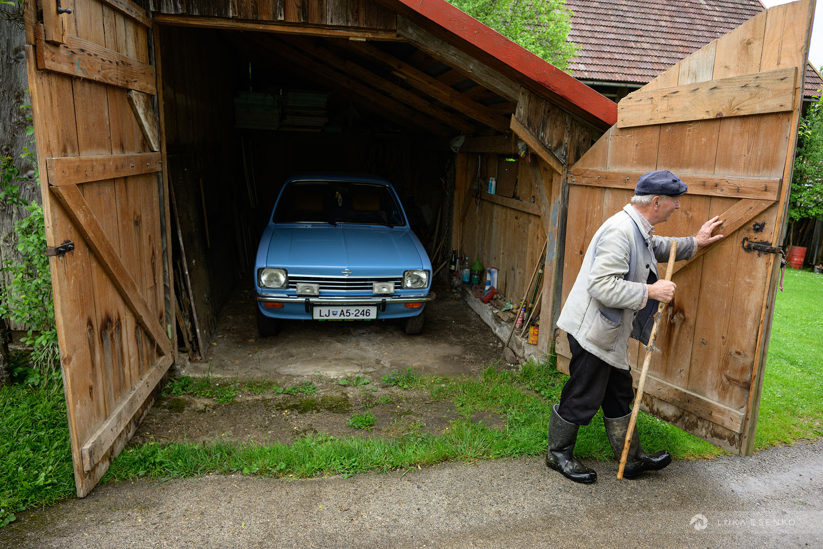We then went to the garden, where Stane arrived, herding chickens and ducks into the barn. At first, he was hesitant to be photographed, but after talking for a bit, he proudly showed us his Opel Kadett, a beautifully preserved old-timer. As we said our goodbyes, Stane invited us to return in the autumn when he would be distilling sadjevec again.