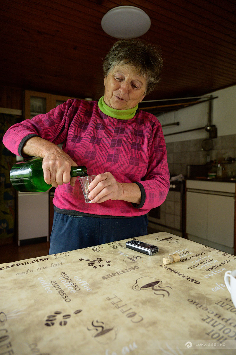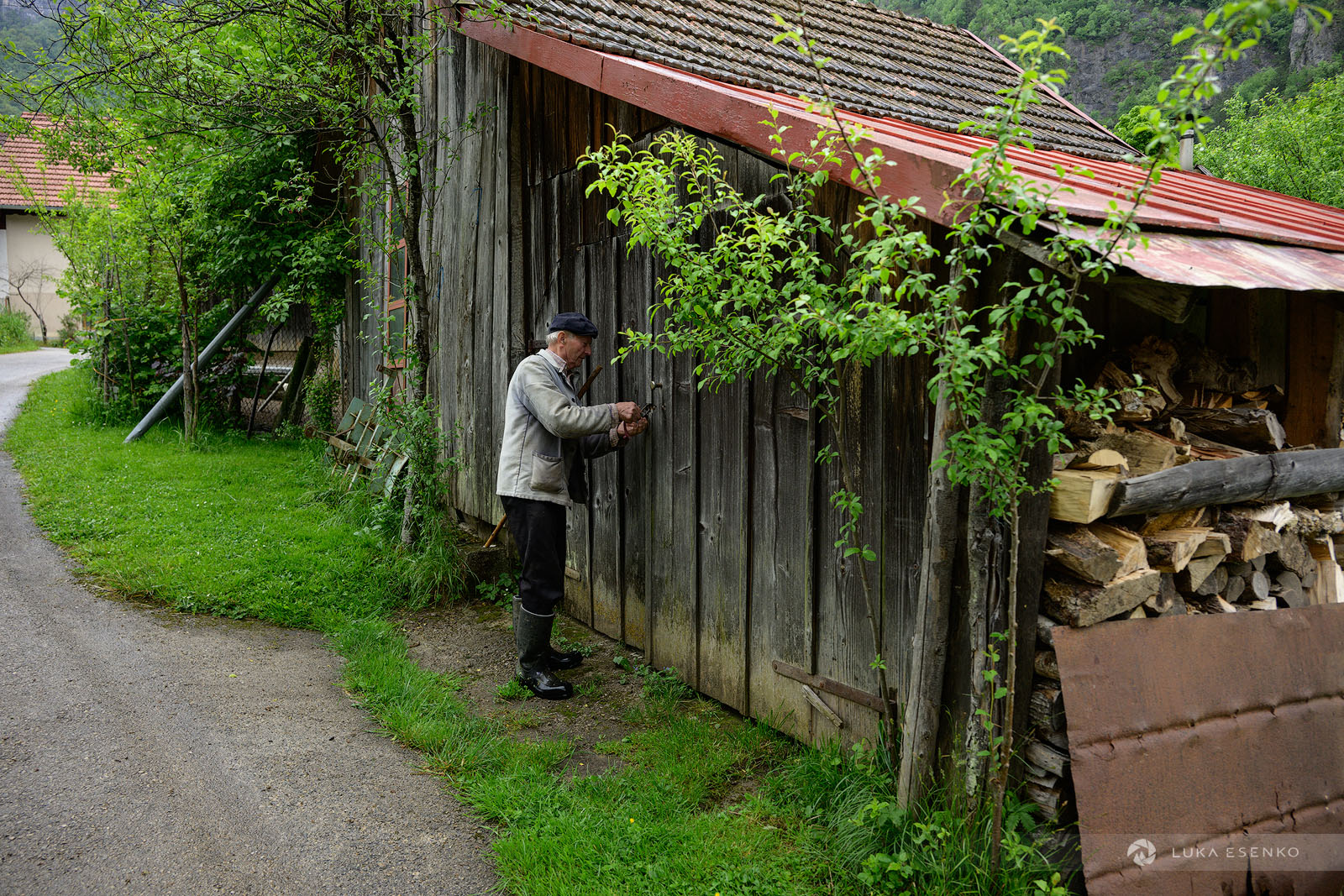 I traveled to the area in early summer with my friends Amadeja and Dan. Our plan was to explore the viewpoints above the Kolpa River and capture the sunset. However, with the weather not cooperating for landscape photography, we decided to explore the river for scenic spots. Instead, we ended up photographing Ribjek village, where Nada warmly invited us into her home for coffee and a shot of homemade sadjevec (fruit brandy).