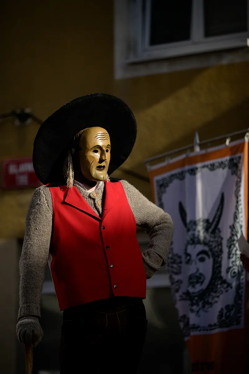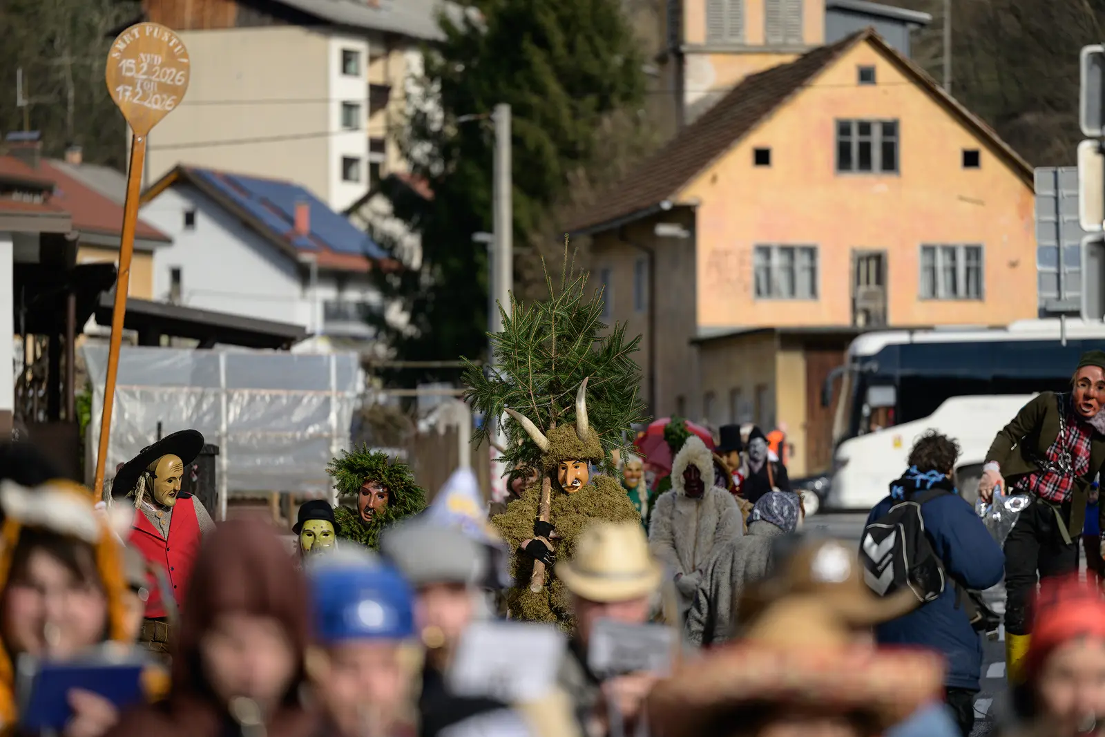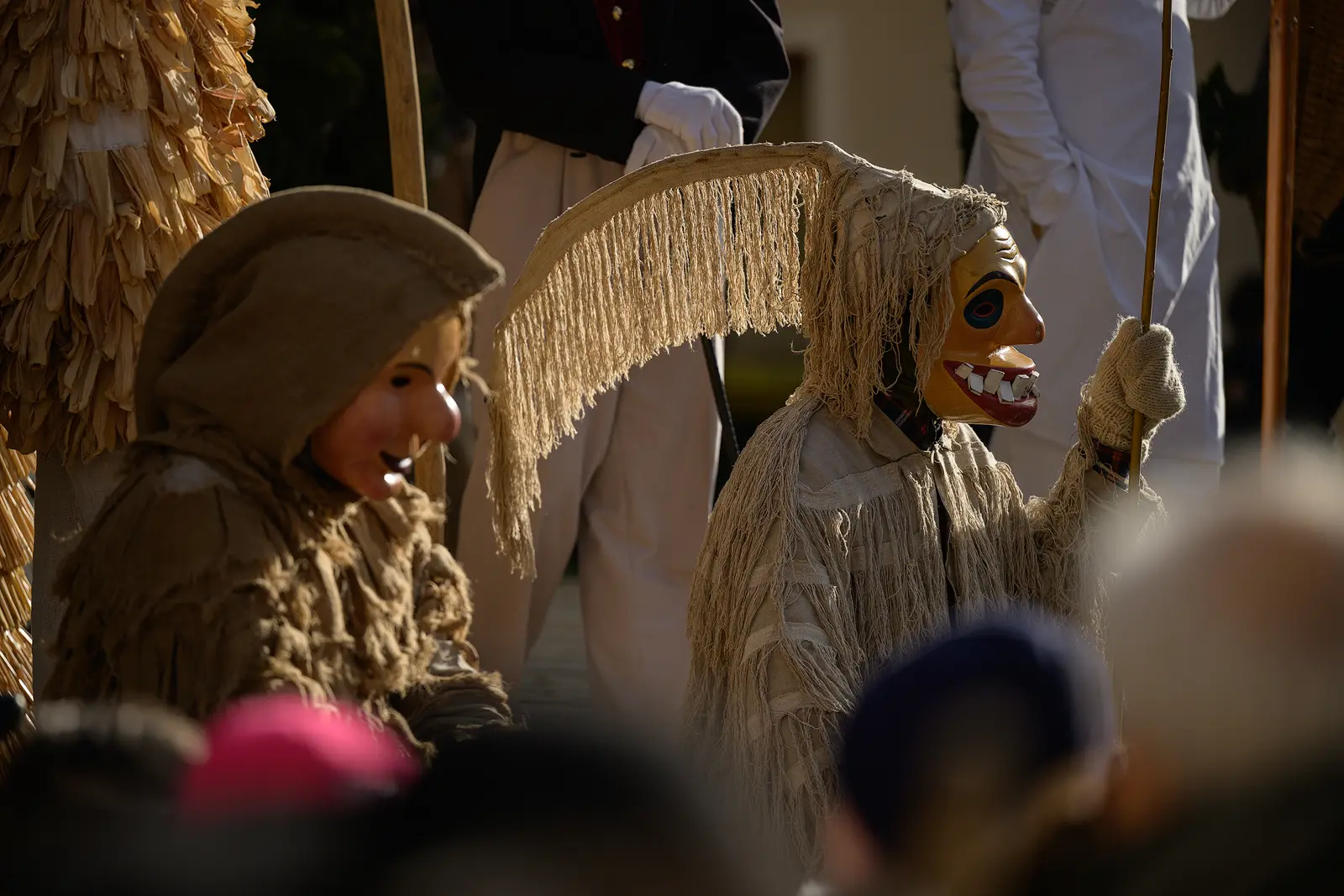 There are 25 traditional characters in the Laufarija cycle. Each appears at a specific time and place during the carnival season, following unwritten rules that locals take seriously. The central figure is Pust — the symbolic scapegoat blamed for the misfortunes of the past year. At the end of the season, Pust is publicly judged and executed, closing the ritual cycle and symbolically clearing the way for spring.