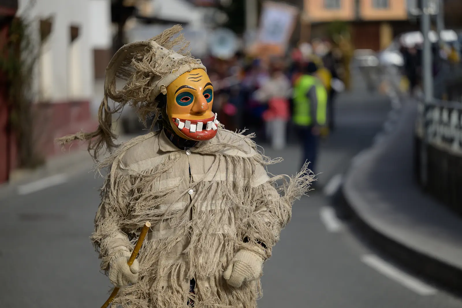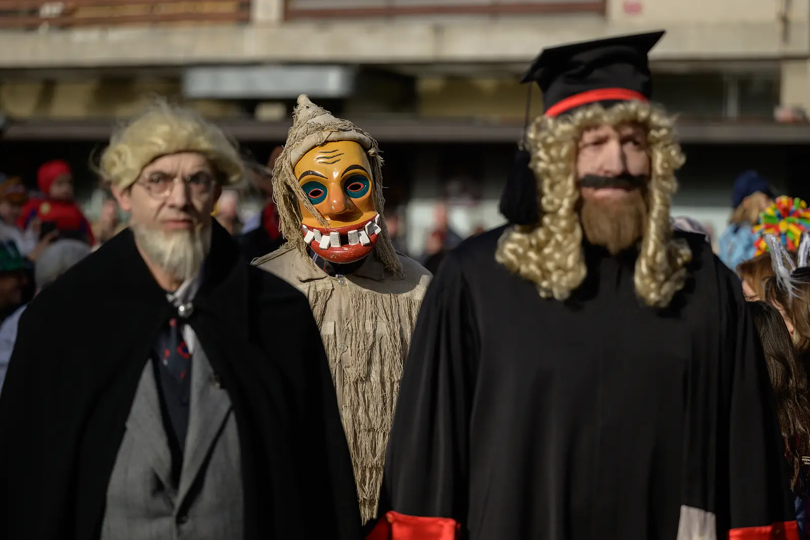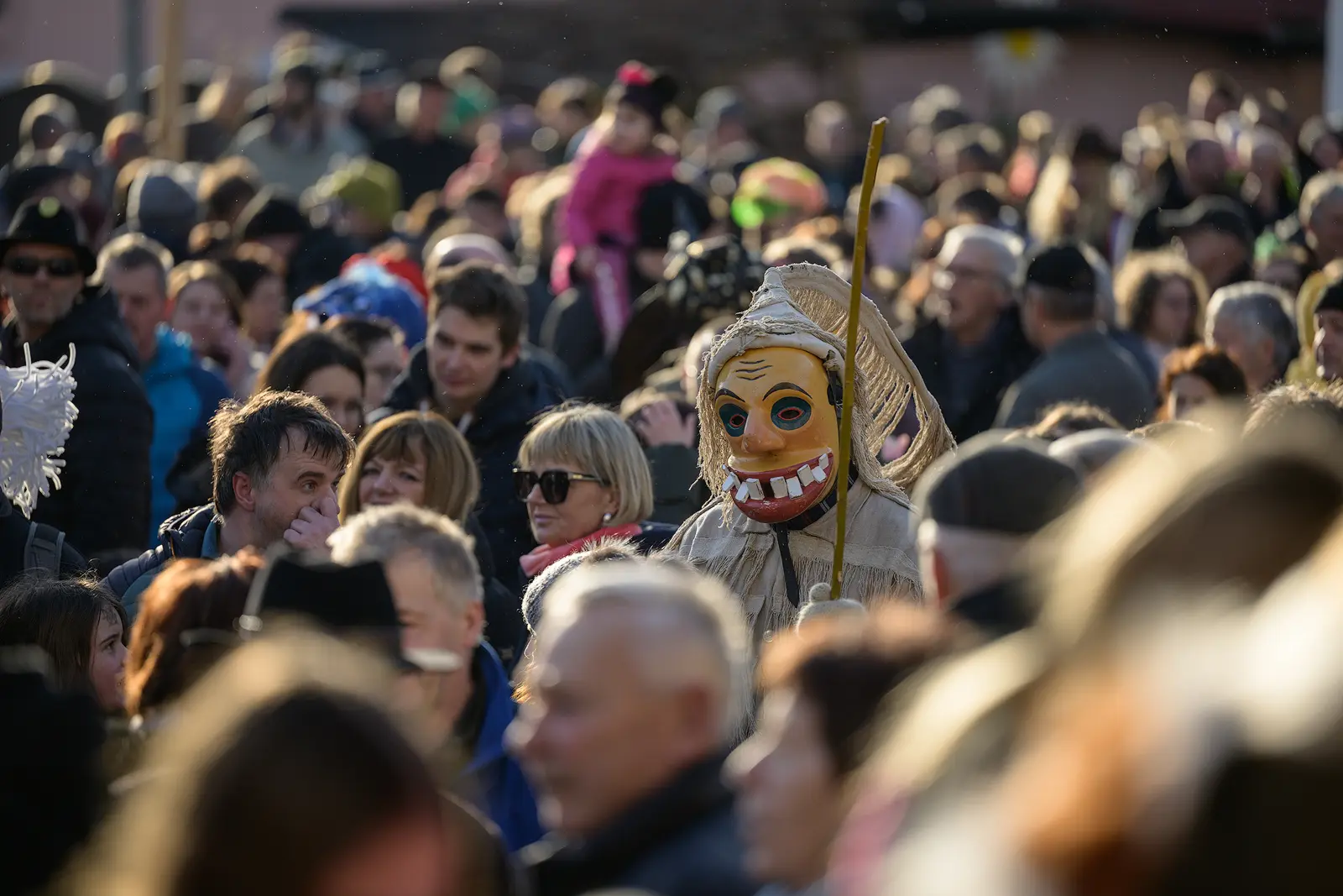 There are 25 traditional characters in the Laufarija cycle. Each appears at a specific time and place during the carnival season, following unwritten rules that locals take seriously. The central figure is Pust — the symbolic scapegoat blamed for the misfortunes of the past year. At the end of the season, Pust is publicly judged and executed, closing the ritual cycle and symbolically clearing the way for spring.