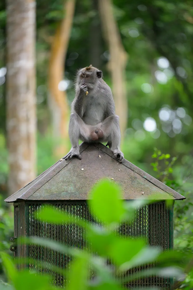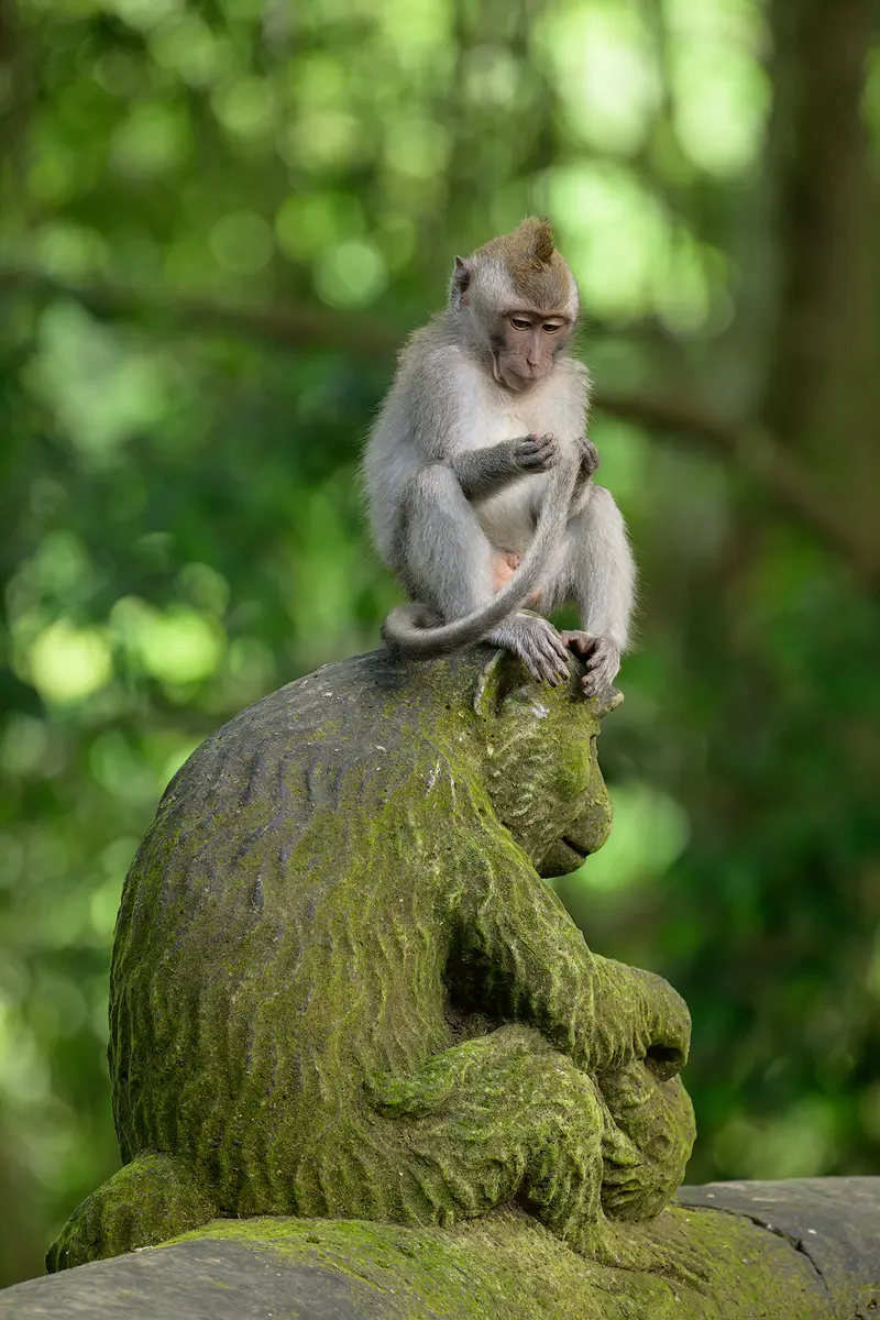 A telephoto lens is definitely the most useful piece of gear here. Having visited the park twice now, I relied on two lenses for the majority of my shots: the Nikon Z 70-200mm f/2.8 and the Nikon Z 100-400mm. Both are fantastic for this kind of photography. Since the monkeys are quite close, extreme reach isn’t a problem. However, the harsh sunlight filtering through the canopy can be tricky to expose for, so it is best to time your visit on an overcast day or when the sun is low on the horizon. Other than that, photographing in the monkey forest in Ubud is quite straightforward and a lot of fun.